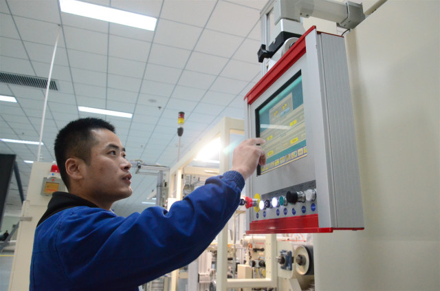 圖為李磊在工作崗位操作全自動進口設備的情形。