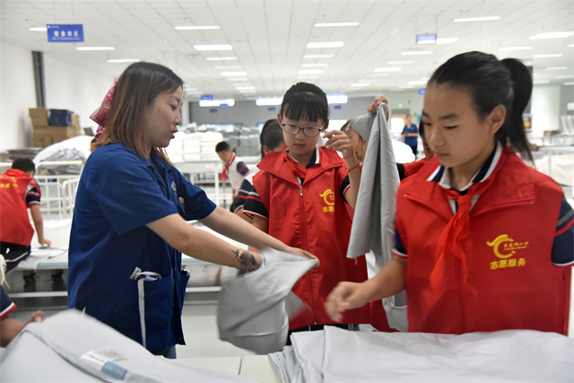 導讀:9月23日,濱城區玉龍湖小學四年級學生在老師帶領下走進公司,實地參觀了公司的生產車間以及部分展廳,現場體驗了家紡產品驗整及包裝等生產環節,感受勞動的艱辛與快樂。