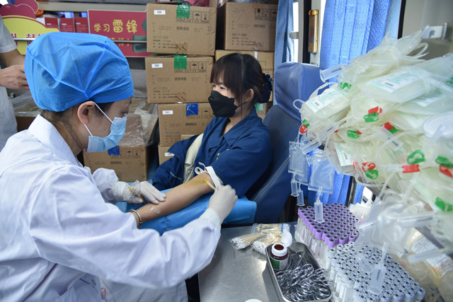 獻血隊伍中,既有工作多年的老同志,也有剛剛參加工作的新員工。獻血車就位后,員工在濱州市中心血站工作人員的指導下,認真填寫獻血登記表、測量血壓、抽血化驗,經血液檢驗合格后開始獻血。“我參加無償獻血的初衷,就是想盡自己的一點力量。”在場參與獻血的一名員工說到。簡單的一句話,展現的卻是充滿溫暖情感的無私之愛。
