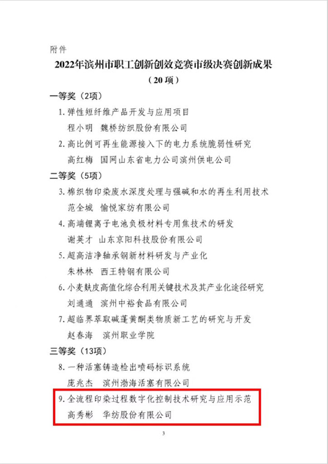 近日,濱州市總工會下發了《關于公布2022年濱州市職工創新創效競賽市級決賽創新成果名單的通知》。公司由信息互聯部軟件開發組主管高秀彬組織開發的“全流程印染過程數字化控制技術研究與應用示范”項目榮獲三等獎。