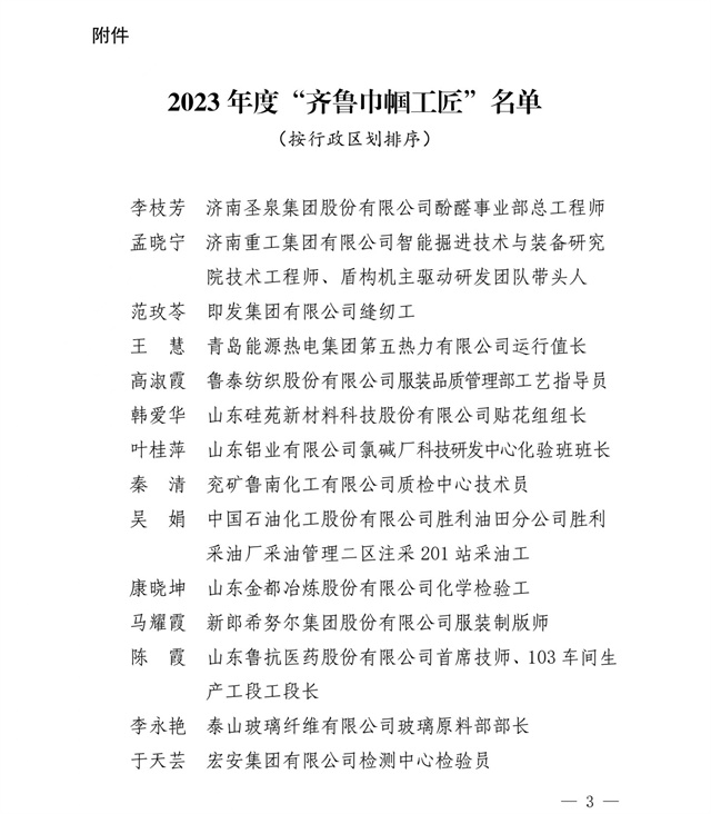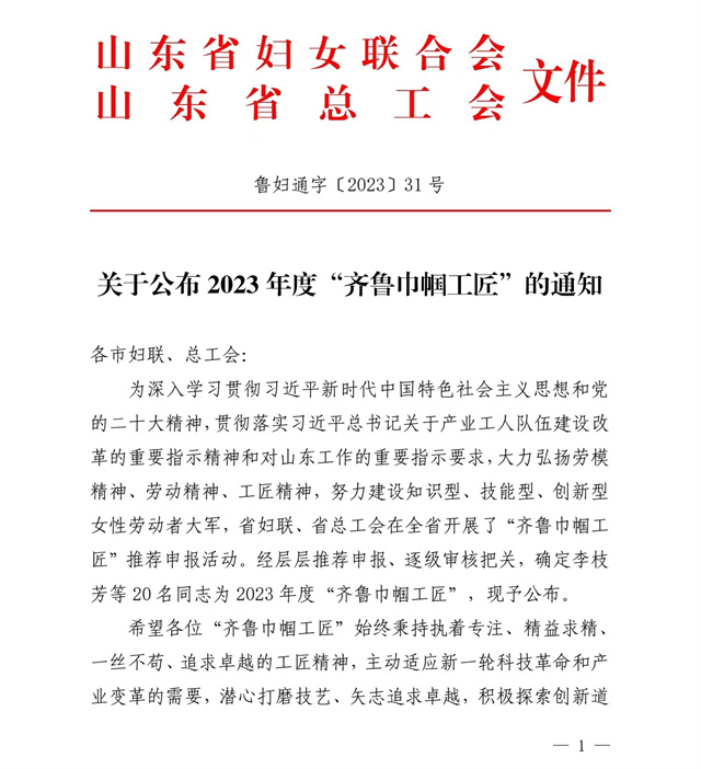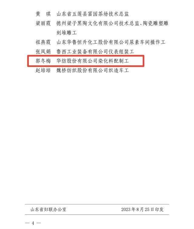 導讀:近日,山東省婦女聯合會、山東省總工會發布了“關于公布2023年度‘齊魯巾幗工匠’的通知”,公司染化料配制工郭冬梅名列其中。