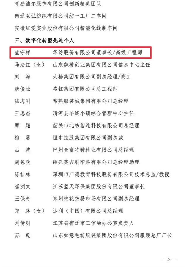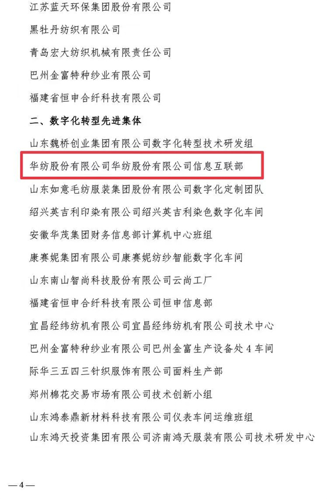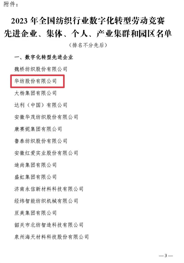 近日,中國紡織工業(yè)聯(lián)合會、中國財(cái)貿(mào)輕紡煙草工會全國委員會聯(lián)合發(fā)布了《關(guān)于2023年全國紡織行業(yè)數(shù)字化轉(zhuǎn)型勞動競賽結(jié)果的通報(bào)》,公司憑借2023年在數(shù)字化轉(zhuǎn)型方面的不斷探索與創(chuàng)新被評為“數(shù)字化轉(zhuǎn)型先進(jìn)企業(yè)”,公司信息互聯(lián)部被評為“數(shù)字化轉(zhuǎn)型先進(jìn)集體”,公司黨委書記、董事長盛守祥先生被評為“數(shù)字化轉(zhuǎn)型先進(jìn)個(gè)人”。