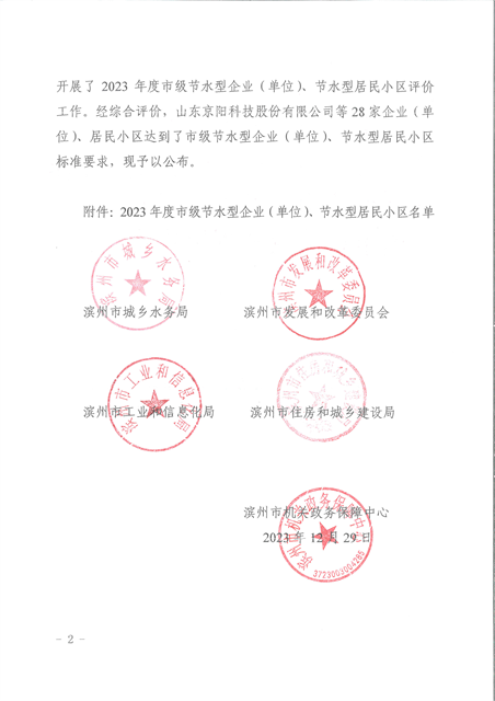 近日,濱州市城鄉(xiāng)水務(wù)局、濱州市發(fā)展和改革委員會(huì)、濱州市工業(yè)和信息化局、濱州市住房和城鄉(xiāng)建設(shè)局、濱州市機(jī)關(guān)政務(wù)保障中心發(fā)布了《關(guān)于公布2023年度市級(jí)節(jié)水型企業(yè)(單位)、節(jié)水型居民小區(qū)評(píng)價(jià)結(jié)果的通知》,經(jīng)綜合評(píng)價(jià),公司達(dá)到市級(jí)節(jié)水型企業(yè)(單位 )、節(jié)水型居民小區(qū)標(biāo)準(zhǔn)要求,獲評(píng)2023年度濱州市節(jié)水型企業(yè)。