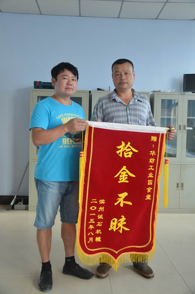 前不久,在公司科技產(chǎn)業(yè)園區(qū)食堂工作的陳春青收到了濱州誠(chéng)石機(jī)械工作人員送來(lái)的錦旗,在對(duì)其拾金不昧表示感謝的同時(shí),也表達(dá)了對(duì)陳春青的敬意。