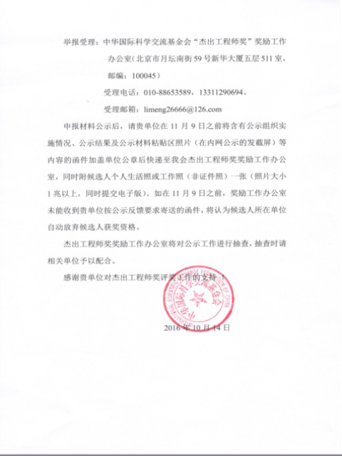 舉報受理:中國國際科學交流基金會“杰出工程師獎”獎勵工作辦公室(北京市月壇南街59號新華大廈五層511室,郵編:100045)