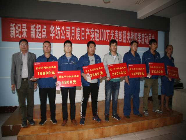 10月11日,公司召開主題為“新紀(jì)錄,新起點,華紡公司月度日產(chǎn)突破100萬米表彰暨決戰(zhàn)四季度動員會”,會上對在9月份印染生產(chǎn)計劃完成工作中成績優(yōu)異的55個機組和41位個人進(jìn)行了表彰獎勵,對第四季度工作進(jìn)行了部署。